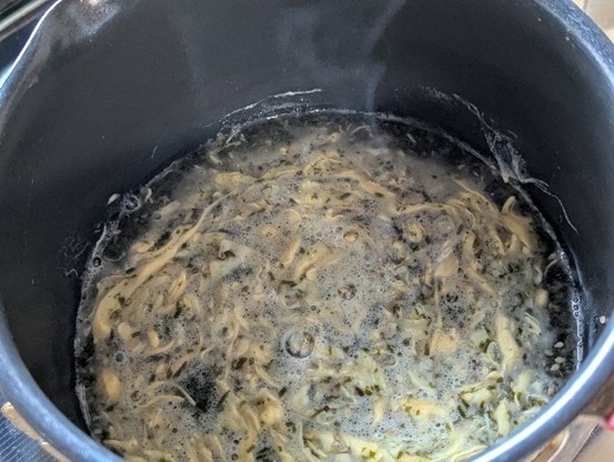 - 2. 鍋に水、白だし、醤油、白ごまをいれて沸騰したら、海のじねんじょを加えます。